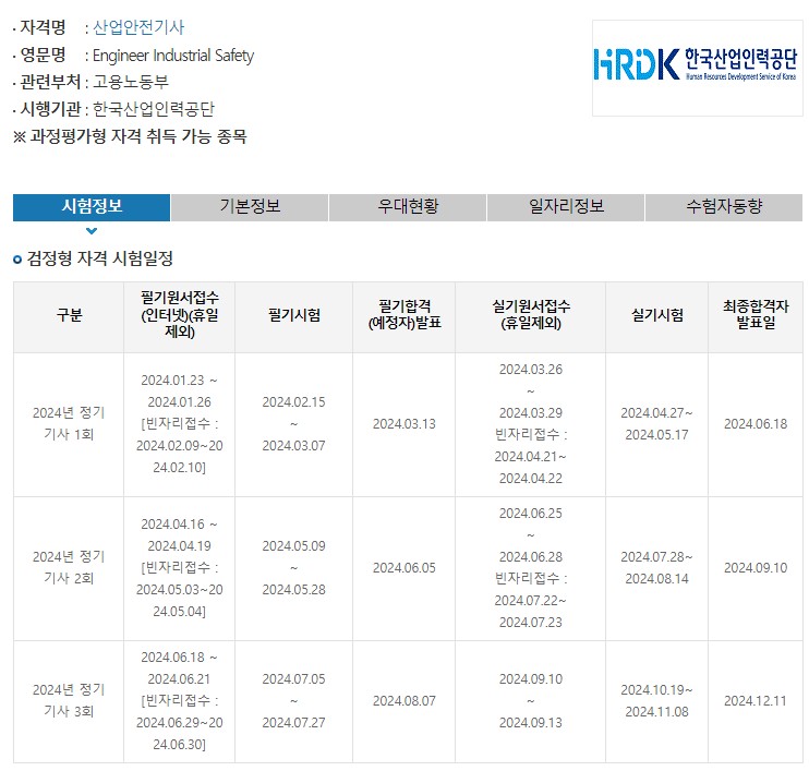 산업안전기사 시험은 1년에 세 번 실시되며, 필기시험과 실기시험으로 나뉩니다. 2024년 시험일정은 다음과 같습니다: